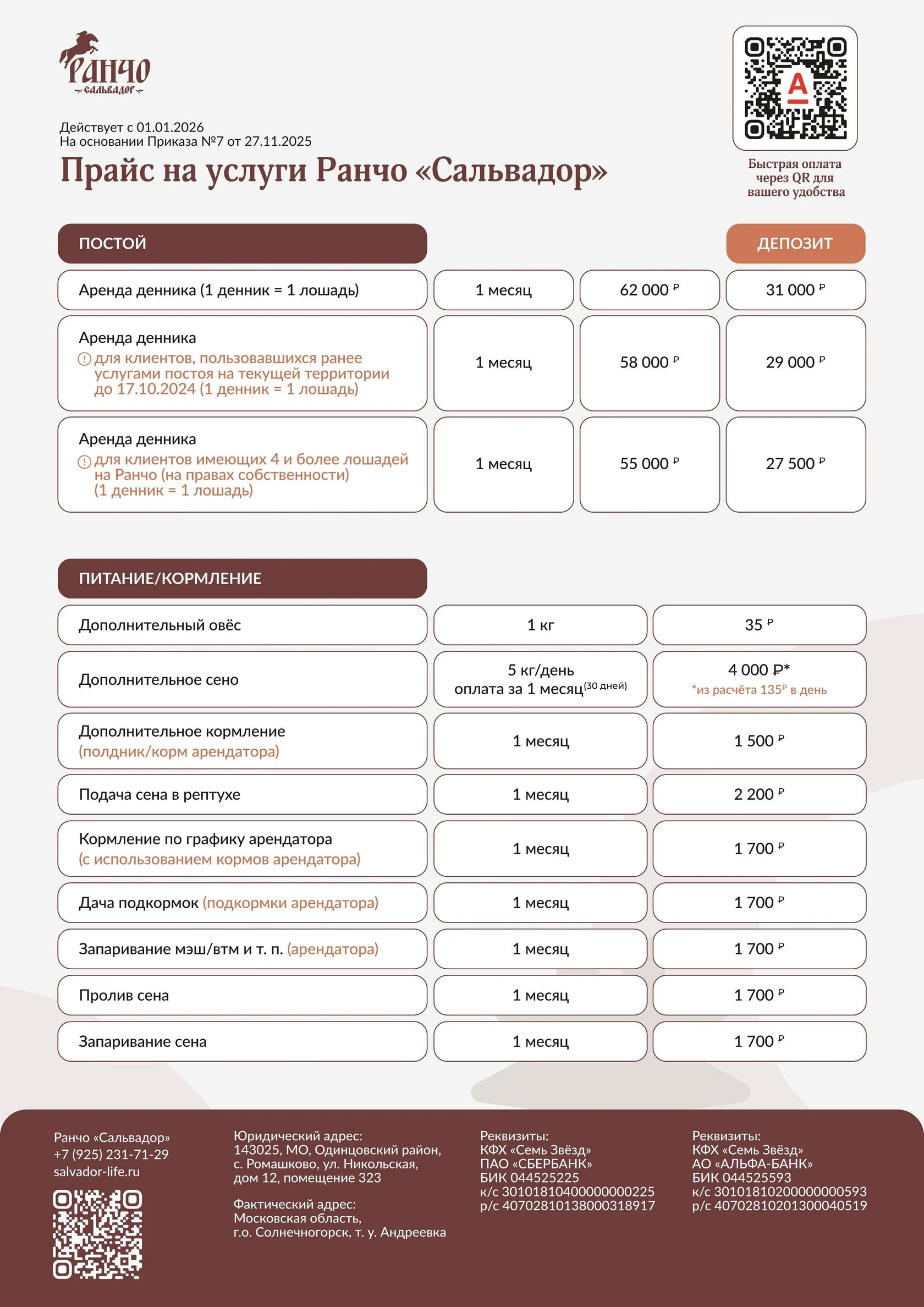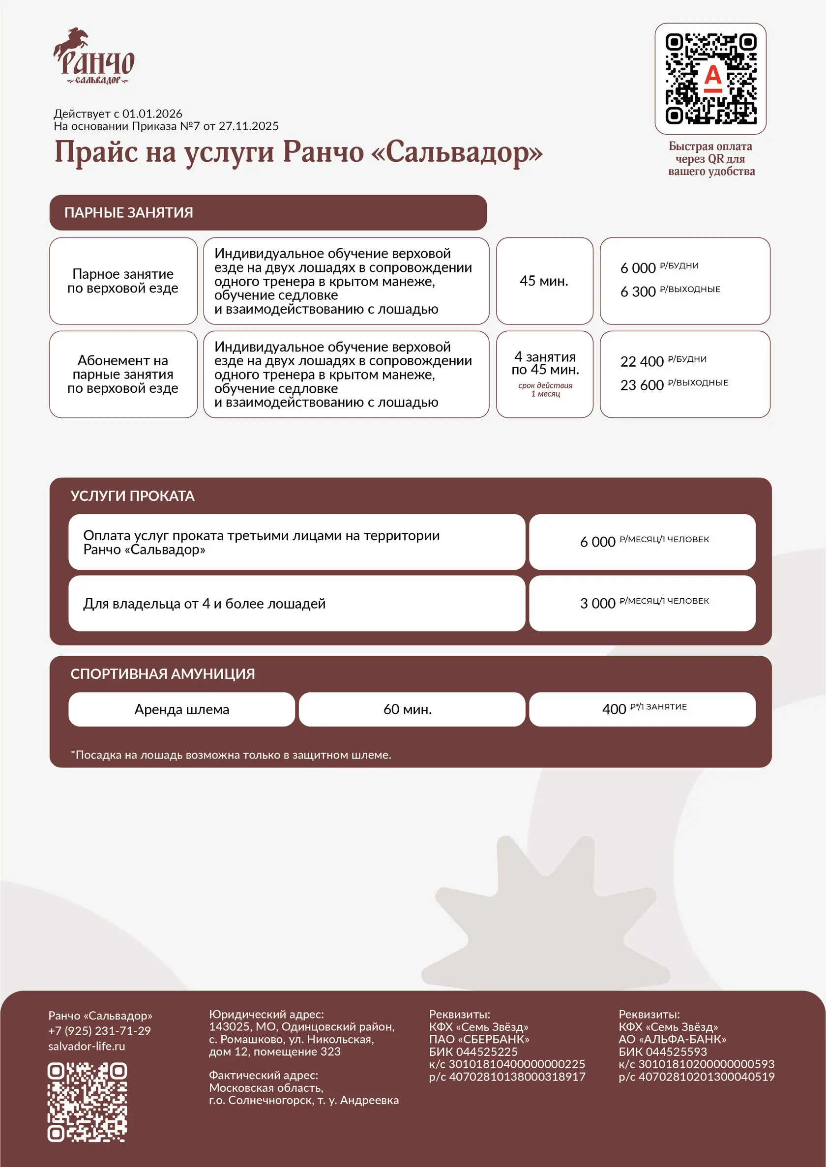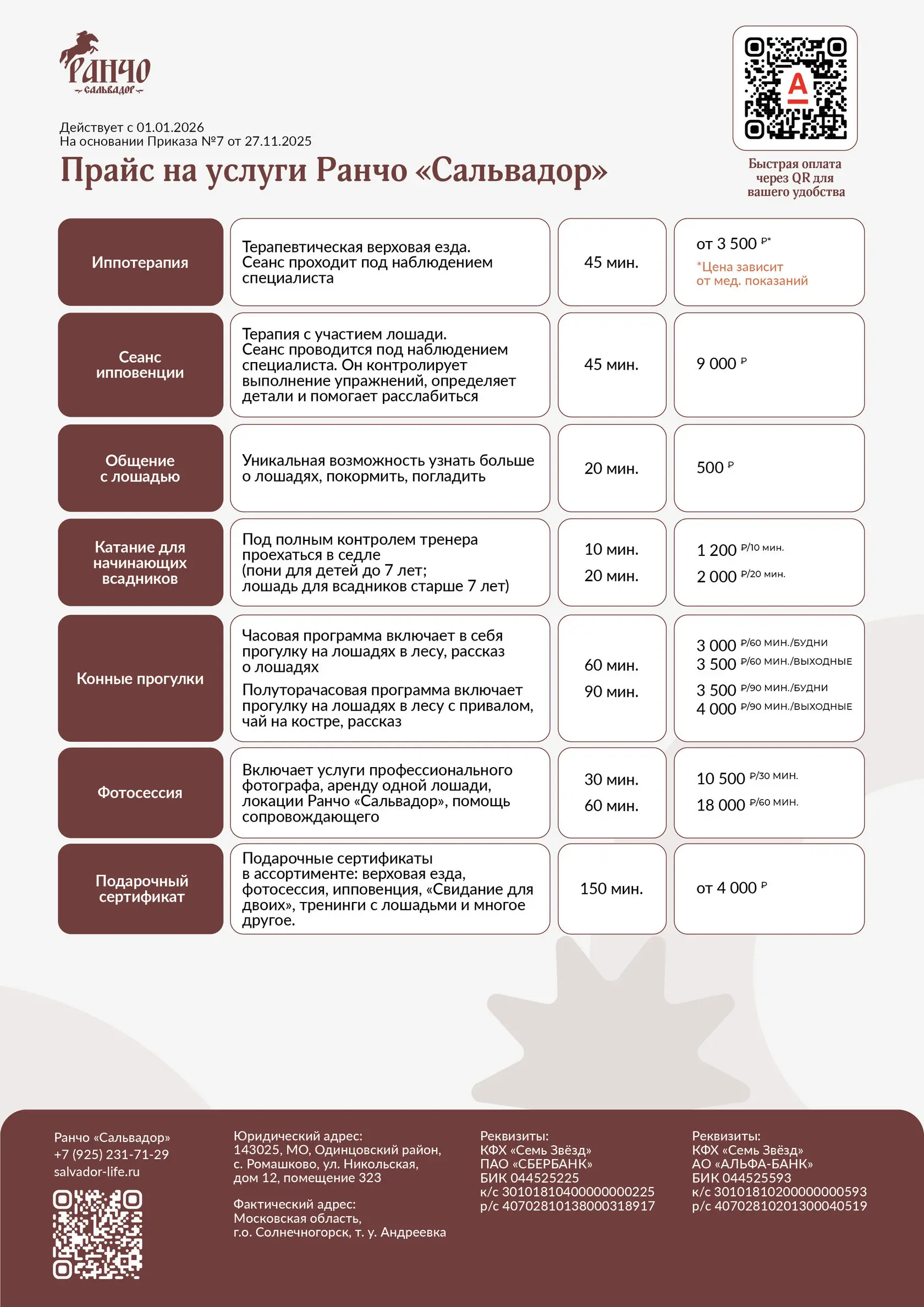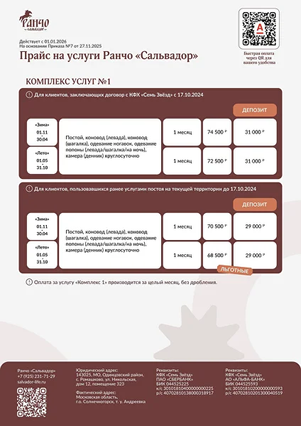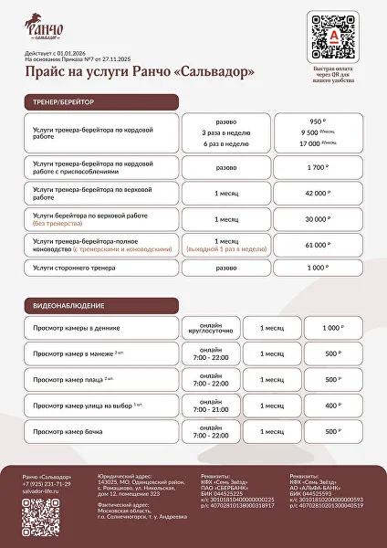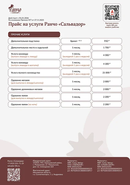 на основании приказа «Об утверждении прайса на услуги Ранчо «Сальвадор»