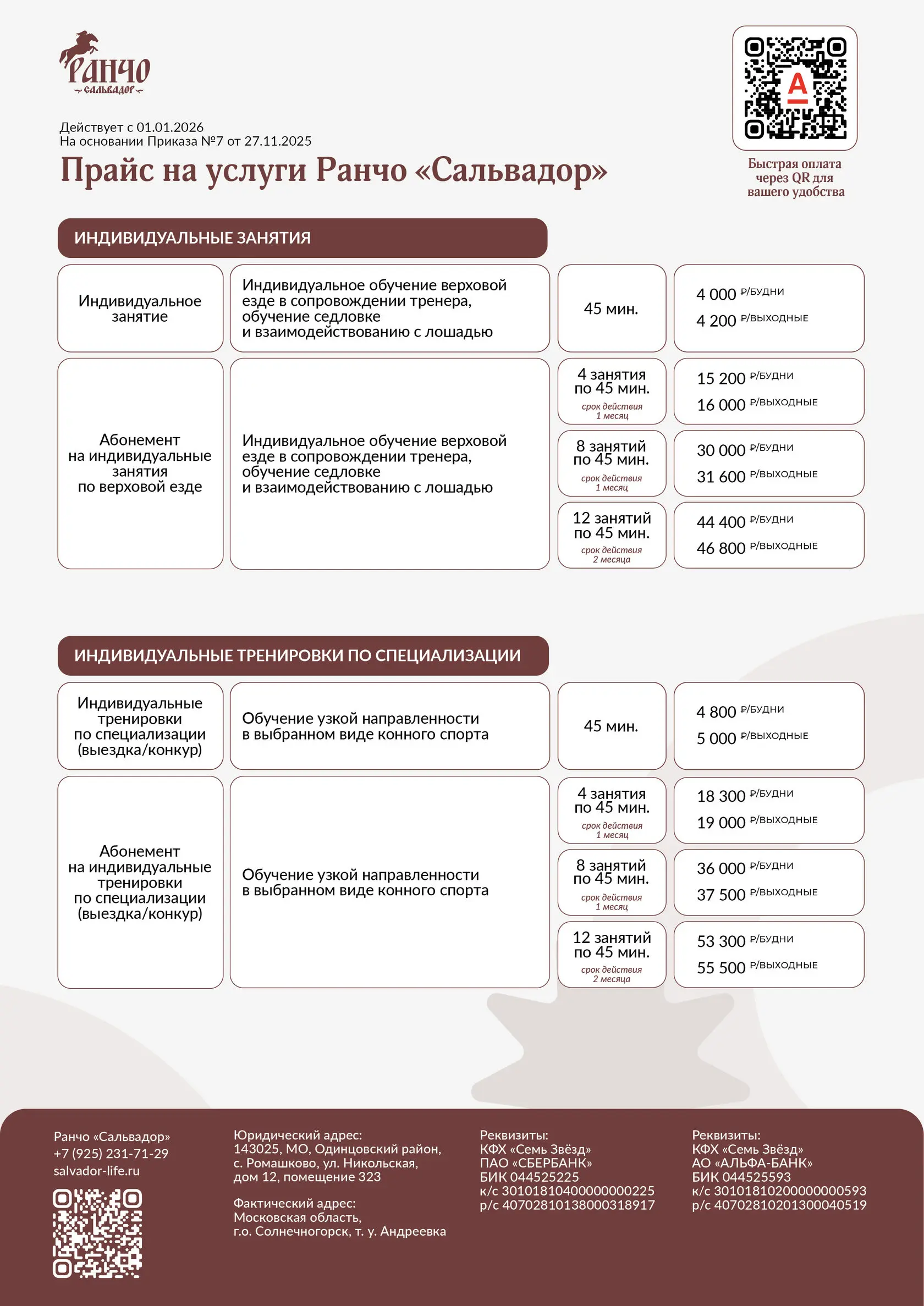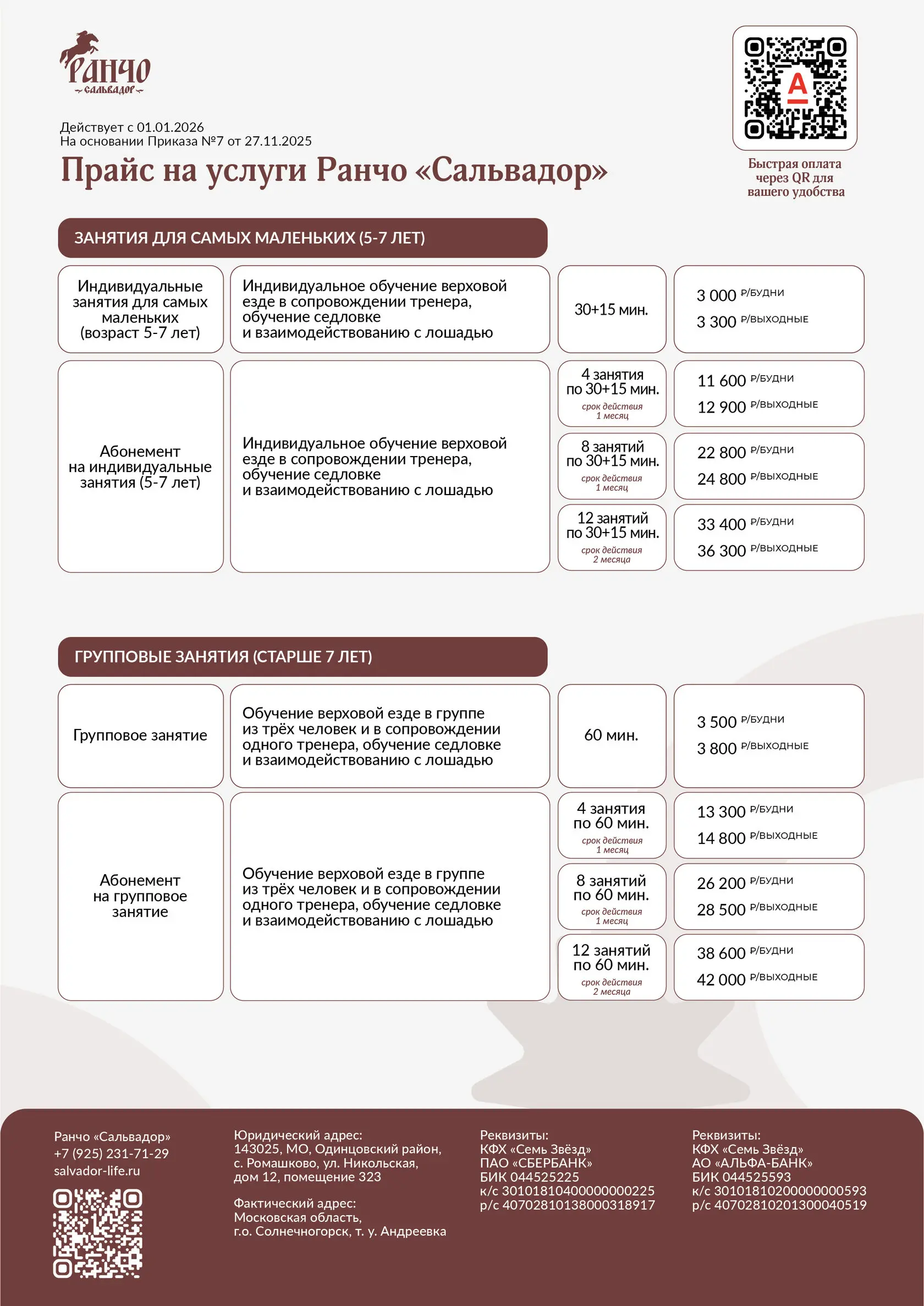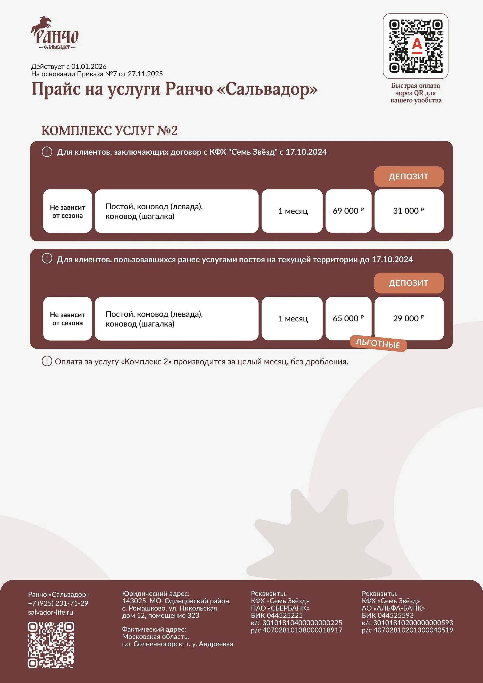 на основании приказа «Об утверждении прайса на услуги Ранчо «Сальвадор»